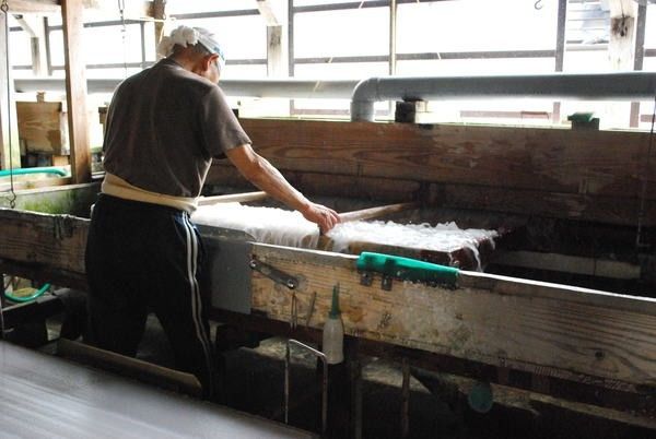 经过日晒的和纸,会再次泡水一晚。而泡水的时间也会按照季节及气温的不同,依靠职人的技巧和判断,才能在最佳时机将纸捞起。