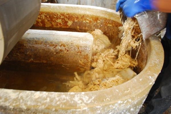 将古纸与和纸原材料,按照一定比例加水混合后,需要经过长时间的绞碎研磨,变成纸浆。