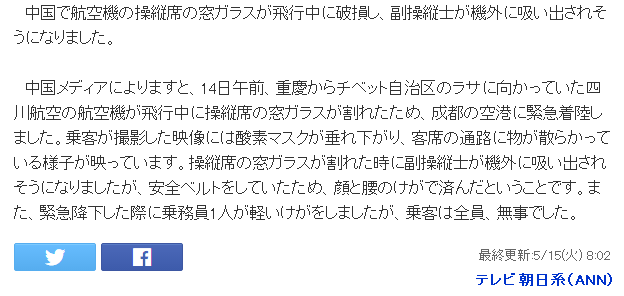 昨天,朋友圈被川航客机驾驶舱挡风玻璃破裂脱落,万米高空惊险迫降一事刷屏,多家日本媒体也纷纷对此事进行了报道。