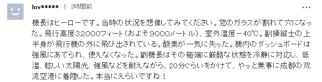 ▲机长真的是英雄。大家想象一下当时的情况,驾驶舱挡风玻璃破裂,飞行高度约9000米,室外温度零下40度,副驾的上半身直接被吹出窗外,瞬间缺氧。驾驶舱内的操作仪器被强风吹毁无法使用。刘机长在那种极极端严酷的环境下还能够冷静应对,抵抗着低温、刺眼的阳光和强风,用20分钟的时间成功迫降。真的太伟大了。
